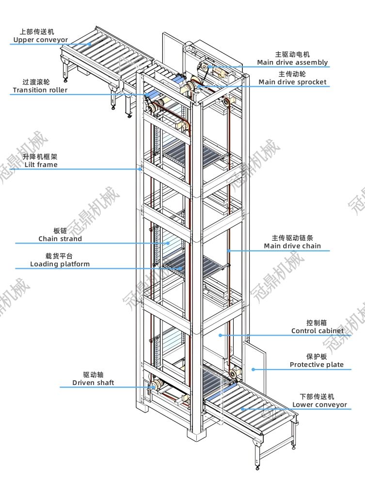 連續(xù)垂直輸送機 (CVC) 用于自動裝載輸送線上,常見的有“Z”型“C”型和“E”型,它占地面積小,傳輸速度快,搬運效率高,能夠?qū)崿F(xiàn)紙盒、托盤、快遞、編織袋、紙袋、行李、貨盤、木桶、鐵桶等貨物在不同樓層間的高效運輸。